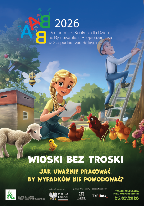 Kasa Rolniczego Ubezpieczenia Społecznego zaprasza dzieci do udziału w VII edycji Ogólnopolskiego Konkursu na Rymowankę o Bezpieczeństwie w Gospodarstwie Rolnym pod hasłem „Wioski bez troski”. Działanie zostało objęte Patronatem honorowym Ministra Edukacji Narodowej Barbary Nowackiej. Partnerem strategicznym wydarzenia są Agro Ubezpieczenia – Towarzystwo Ubezpieczeń Wzajemnych, a patronat medialny sprawuje TVP Info.