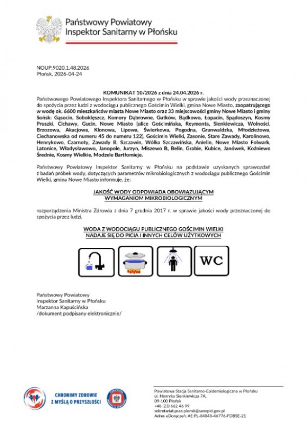 woda z wodociągu Gościmin Wielki jest zdatna do picia oraz do codziennego użytku