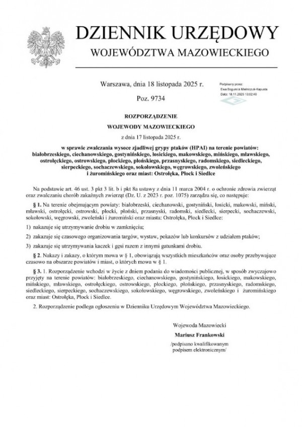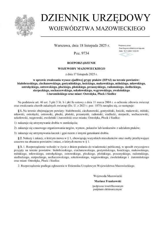 Rozporządzenie Wojewody Mazowieckiego w sprawie zwalczania wysoce zjadliwej grypy ptaków (HPAI)