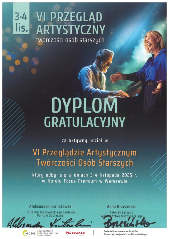 W dniach 3-4 listopada 2025 roku, w warszawskim hotelu FOCUS PREMIUM odbył się VI Przegląd Artystyczny Twórczości Osób Starszych. Organizatorem przeglądu było Mazowieckie Centrum Polityki Społecznej, a finansowego wsparcia udzielił Samorząd Województwa Mazowieckiego. Zgłosiło się 1800 osób. Z tej olbrzymiej rzeszy ludzi, specjalna komisja zakwalifikowała 350 osób – 24 zespoły seniorskie z całego Mazowsza.